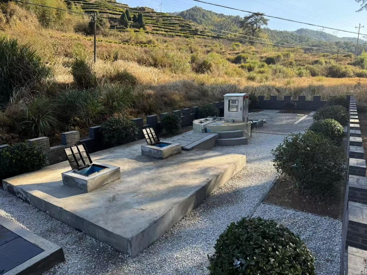 浙江省丽水市景宁畲族自治县景宁县深垟村的农村生活污水处理30吨/天,核心工艺是采用MABR透氧膜将氧气传递至附着生长的生物膜,实现同步硝化反硝化,去除有机物降低氨氮,出水导入二沉池进行泥水分离,分离后的上清液经过紫外线消毒杀灭病菌微生物后流入人工湿地,在人工湿地微生物及植物吸收的作用下进一步脱氮除磷,最后达标排入周边水体,出水达到《农村生活污水集中处理设施水污染物排放标准》(DB33973-2021)中的二级标准,目前已顺利通过项目竣工验收。
